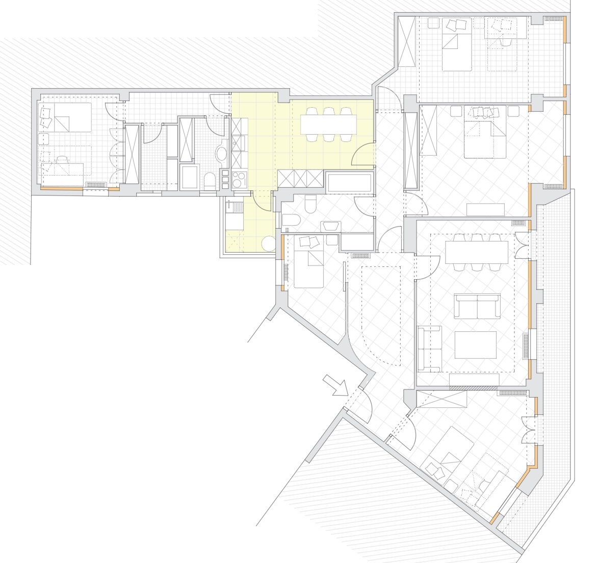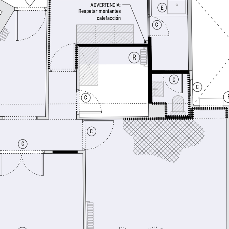 Realizaremos un plano de demoliciones con todas las actuaciones a realizar: derribos, desmontajes de carpinterías, levantado de suelos, etc. Dentro de este plano encontrará advertencias para aquellas zonas que identifiquemos como peligrosas por riesgo de dañar la estructura o instalaciones comunitarias.
