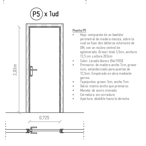 Elaboraremos planos de memorias de carpinterías interiores (puertas de paso y acceso a la vivienda) con especificaciones técnicas y materiales del tipo de puertas a colocar, cerrajerías, etc