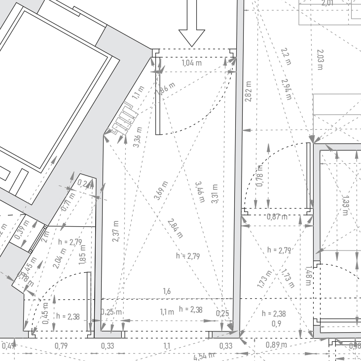 Mediremos su inmueble de forma precisa utilizando escaneado 3D, fotogrametría, metro laser, triangulaciones, arreglos, etc. Identificaremos elementos singulares: elementos comunitarios, estructurales, etc, para posteriormente decidir qué mantener y qué demoler. El resultado final será un plano fiel a la realidad