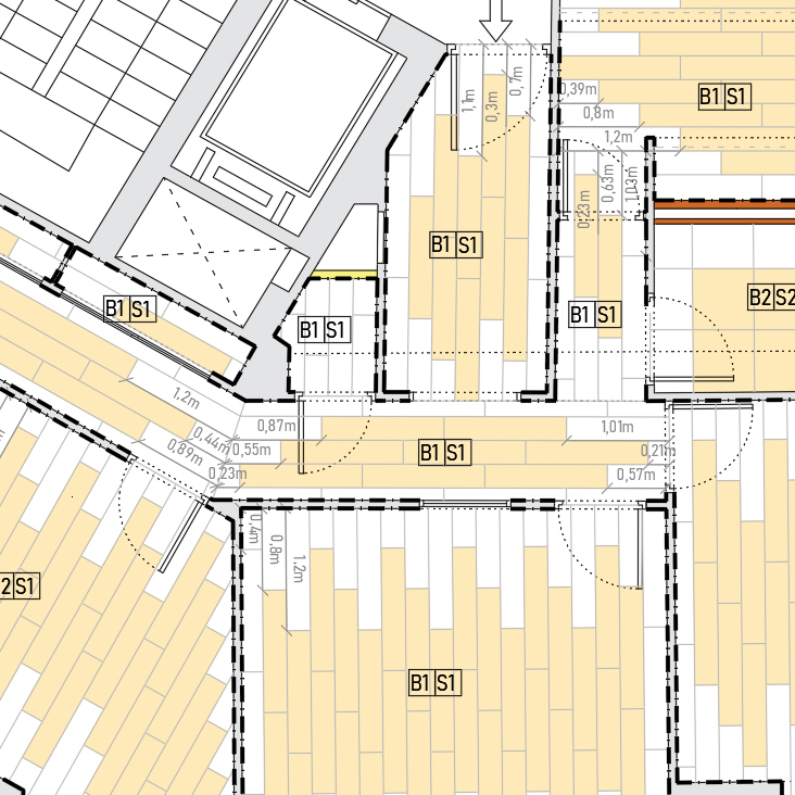 Elaboraremos planos de solería con el tipo de suelo, dimensiones de baldosa, especificaciones técnicas y estéticas, tipo de rejuntado y juntas de dilatación, forma de colocación, especificaciones de materiales adhesivos y plano de despieces de solería.